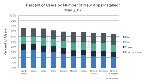 In South Korea, China, Brazil, and India roughly 30 percent of those surveyed downloaded four or more mobile apps.