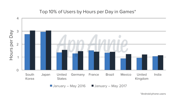 In eight of the nine of the countries surveyed, the top ten percent of mobile players saw an increase in daily game time. In the two top countries for mobile games, South Korea and Japan, daily use of the top ten percent now eclipses three hours a day on Android devices.